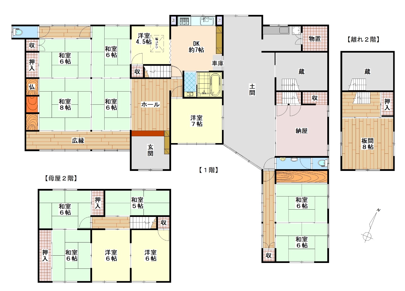 ■設備関係/上水:公営 汚水:本下水 雑排水:本下水 電気:中部電力 ガス:オール電化 ■交通アクセス/JR関西本線「佐那具駅」まで約2.1㎞、名阪国道「壬生野IC」まで約550m ■離れ詳細/本物件には上記のほか、別の家屋番号及び未登記建物で以下の建物があります。 種類:倉庫・物置 構造:木造瓦葺2階建 床面積 1階:45.20㎡ 2階:35.11㎡ 種類:居宅 構造:木造瓦葺平家建 床面積 28.87㎡(昭和46年築 未登記) ■その他/ ・本物件には、上記のほか農地(地目:田(現況畑)、地積:125㎡)があります。 そのため、登記費用のほか農地法第3条の許可申請の費用が必要になります。 ■固定資産税/ 72,000円 ■現況有姿/本物件は現況有姿でのお引渡しとし、未登記建物においても更正登記等をせず、未登記のままでのお引渡しとなります。 |